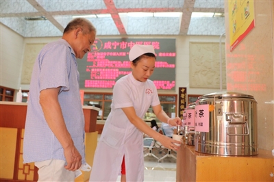 据悉,自7月19日推出免费养生茶服务以来,市中医医院的工作人员每天早上都会精心泡制三桶养生茶放置服务台,患者、家属随时自取。喝完后,工作人员及时添加。