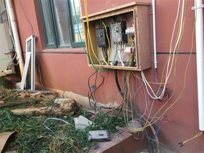 昨日下午5时许,记者接到投诉后来到该小区,小区门口附近聚集了许多居民,有些老人小孩坐在树荫下乘凉。小区一楼墙壁外不足一米高的地方,一个没有门的空开箱内,杂乱无章地接了多根电线(如图一),电线沿着墙壁拉到4楼,上十根网线像蜘蛛网一样从一楼拉到楼顶。