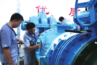 昨日上午9时许,在咸宁联合水务王英水厂泵房,局部最高温度达40℃,噪音达60多分贝,工作人员正有条不紊地对设备进行巡查。