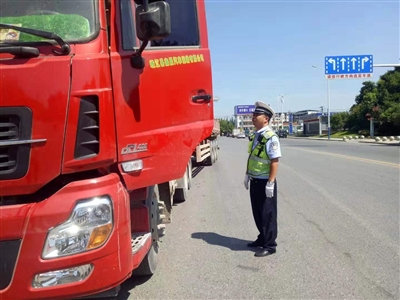 阚冲和同事从张公驾考考试路段出来,已经上午10时许,路面温度超过40℃,他们紧接着又来到嫦娥广场路段。“有许多大型货运车辆由此路段进出城,时有超速、超载、非法改装等严重交通违法行为。”阚冲说。
