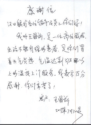 7月30日,一位王女士送来手抄感谢信,赞喻汉口银行咸宁分行便民服务“暖人心”。