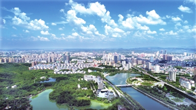 昨日,记者通过无人机航拍市区上空看到,一朵朵白云像棉花糖一样,点缀在蓝天之上, 美不胜收。 记者 赵忠志/摄