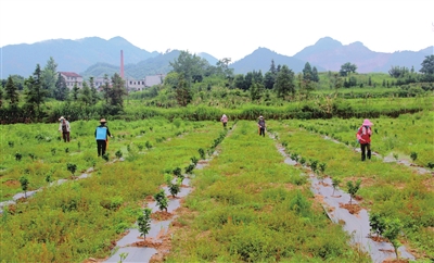 近日,通山县南林桥镇砂糖橘示范基地上,附近村民正来回穿梭,忙着打药除草。