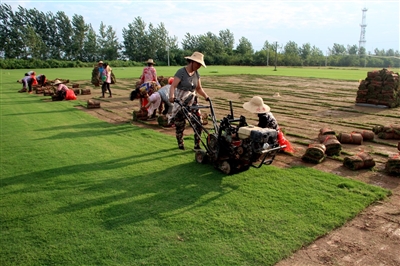 该基地占地1200亩,共育有百慕大、果岭草、马尼拉等6个品种,一年可收三轮,经济效益可观,常年吸纳周边40多名村民务工,高峰期日用工量达百余人,有效带动了村民就业增收。