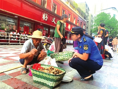市城管一大队四中队队员杨亚慧是一名女同志,面对摆摊的老人,她选择蹲在地面上,一个个劝说,但很多小贩根本不为所动。10分钟之内,对一名摊贩就得来回沟通三四遍,都还不见得有效。
