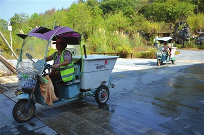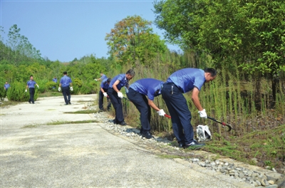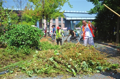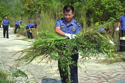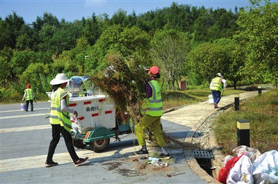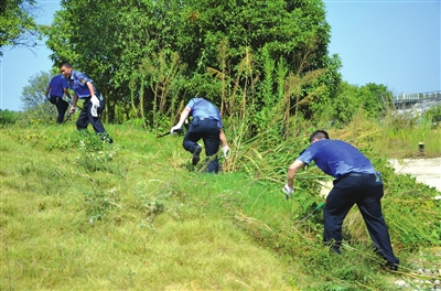 园内的茅草长的有一米多高,城管志愿者用镰刀不停地割除;地面上丢下的纸屑、塑料瓶等垃圾长期无人清扫,城管志愿者一路走一路捡;绿化带里随处可见散落的树枝,城管志愿者拾起一捧又一捧……