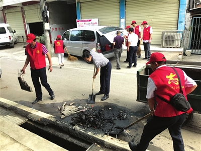 本报讯 (记者 徐浪 通讯员 肖满诗) 装运污水沟抽出的杂物、清理街道死角垃圾……9月5日一早,在咸安区双龙路社区向阳巷,来自工行咸宁分行的一群身穿红马甲头戴小红帽的党员志愿者们干得热火朝天。