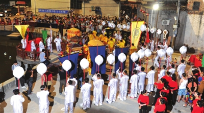 天已黑,大屋雷各分祖各家各户门前都挂起了月亮灯,来自四面八方的村民们簇拥着仪仗队,如潮水一般,从村头涌到了被灯火照得雪亮如银的八祖堂。
