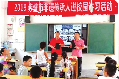 当天,赤壁市文体广电新闻出版局联合赤壁市群众艺术馆和赤壁市非物质文化遗产保护中心,举行“赤壁市非物质文化遗产名录展暨2019赤壁市非遗传承人进校园”活动。