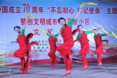 9月28日晚,市民政局、市福利院、市群艺馆等单位联合主办庆祝新中国成立70周年“不忘初心 牢记使命”主题教育暨创文明城市建平安小区文艺演出。(记者 赵忠志)