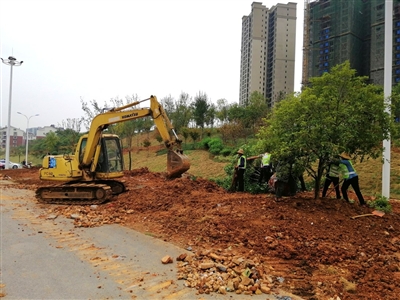 据现场施工负责人介绍,该路段正在进行绿化升级,将原来较为脏乱的荒地、护坡等处进行清理,种植桂花树、三角枫、红花玉兰、草坪等,美化城市环境,预计本周内可完工。 (记者周阳)