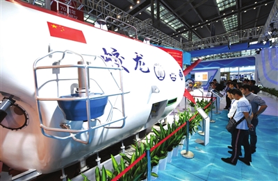 作为“可下五洋捉鳖”的利器,有着橙色“头顶”、白色“身体”、身似大白鲨的“蛟龙号”载人潜水器模型,堪称展会上人气最高的展品之一。这个由我国自主研发的载人潜水器,在马里亚纳海沟创造了下潜7062米的中国载人深潜纪录,这也是世界同类作业型潜水器最大下潜深度纪录。