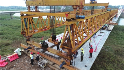 当天上午10时,在项目工程师的指挥下,20多名施工人员各就各位,开始施工操作,一台大型吊装机将窑咀河两岸水泥桥身慢慢吊起相向而移,施工人员时而调整桥身方位、时而检查桥梁“吻合"间隙,在场百余双眼晴随着桥身的徐徐移动而关注着。“好!”一刻钟左右,现场总指挥一声令下,桥身接头处刚好落在预定位置,“无缝”连接完好,“亲密吻合”。一座全新大桥便雏形渐显,“横跨”南北两岸。