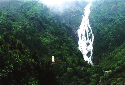 黄袍山下还有一岩名石溪岩、又名玉溪岩、白水岩等,有大水,奔涌泻下而成巨瀑,名黄袍山白水崖瀑布。是中国十大落差最大的瀑布之一,被称为“华中第一瀑”,瀑布单级落差约210米,瀑布岩右上有天然石洞,内约数十平米,可以容近百人。