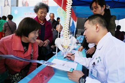 活动中,骨科博士陈明率专家团队在现场设专家义诊区,为市民提供免费诊断及理疗按摩,血压、血糖、骨密度等检测检查。 (记者陈婧)