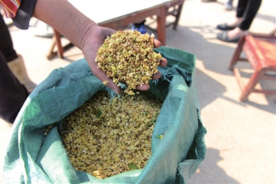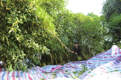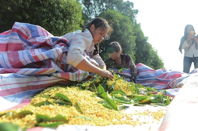 打桂花时,妇女们在桂花树下拉好巨大的棚布做好接花的准备,而男性村民则拿着长竹竿使劲地拍打桂花树,桂花和树叶夹杂在一起下落,桂花像雨一样纷纷扬扬撒落下来,望着棚布上堆得满满的桂花,花农的脸上洋溢着按捺不住的喜悦。“花雨”停后,村民们把树叶、树枝等杂物挑出来,将剩下的桂花装进竹篓里挑下山,并再次筛滤和翻拣,只余下干净的新鲜桂花。新鲜桂花晶莹剔透,阵阵清香沁人心扉。