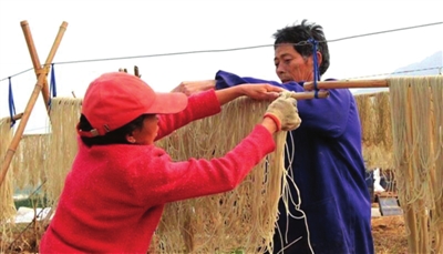 图为新店镇雨亭岭村农业资源综合开发项目区村民正在做红薯深加工,晾晒苕粉丝。