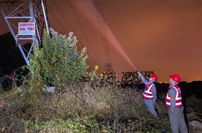 10月24日晚,赤壁市供电公司军运会保电工作人员陈红星、陈庆忠对军运会供电220千伏输电线路进行巡视、巡查。