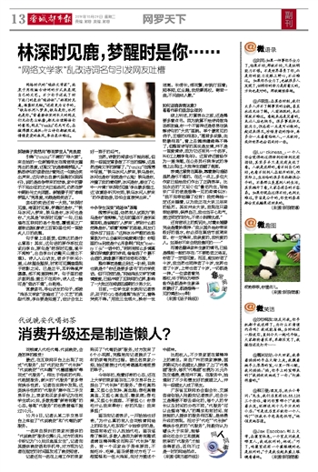 网络时代的“鸡汤文学家”,热衷于用改编古诗词的方式来表现自己的文艺。不少句子还成了时下热门的表白“鸡汤体”:“林深时见鹿,海蓝时见鲸。”还有更为玄乎的,“铁马冰河入梦来,铁马是你,冰河也是你。”背着唐诗宋词长大的网友们无论怎么琢磨,都无法理解语句的意思,网友“Yunikz”忍无可忍,在微博撰文痛批:什么诗句都被改成情情爱爱的画风,李白表示难过。
