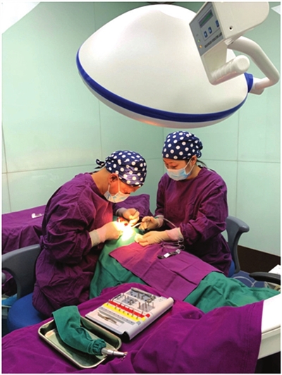 沈叔叔来到湖科口腔医院之后,由许炎标院长查看了沈叔叔的牙槽骨情况。为沈叔叔制订All-on-4微创即刻种植修复方案。该技术只需要植入4颗种植体即能恢复半口好牙,而且当天就能进食,沈叔叔和儿子认真商量后同意了这一方案。