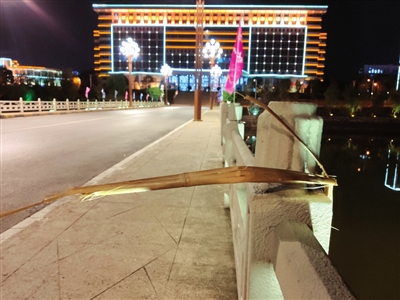 本报记者随后赶到现场,在同心桥两侧护栏处看到约有22面标旗已经从中段或根部被损毁折断,旗帜不见去向,原本两排整齐排列的咸马标旗变得残缺不全。