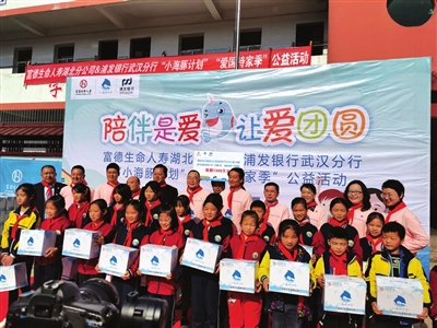 本报讯 (记者 徐浪 通讯员 赵婉矣) 11月22日一大早,暖阳高照,一支满载爱心人士的车队从武汉、咸宁温泉两地出发,在咸安区大幕乡金鸡山小学汇合。金鸡山小学坐落于大山深处,拥有200多名学生,90%为农村留守儿童。富德生命人寿湖北分公司携手浦发银行武汉分行走进金鸡山小学,隆重举办“小海豚计划”“爱国持家季”爱心助学公益捐赠活动,为这个偏僻的乡村小学带来了温暖和关爱。人行咸宁中心支行副行长皇震、银保监局咸宁分局副局长戴海林,市地方金融局、市扶贫办相关领导及富德生命人寿省市公司负责人、浦发银行武汉分行相关领导等共同出席了捐赠仪式。