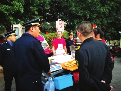 执法人员对市实验小学周边食品流动摊贩及食品经营门店进行全面清查,检查流动摊贩从业人员是否办理有效健康证明、食品原材料是否过期变质、是否使用非食品容器盛装食品及食品原料、卫生状况是否达标、食品制售操作流程是否规范等,并对周边食品经营门店进行清查,查看证照是否齐全,索证索票和食品进货查验制度落实情况,禁止其销售“三无产品”和假冒伪劣食品。