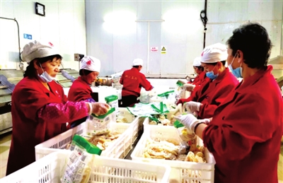 22日,嘉鱼县陆溪镇嘉珍生态农业发展有限公司加工车间,工人们正在包装莲藕。