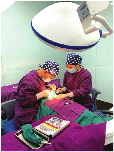 通过数字化口腔CT全景机,种植专家许炎标院长在术前获得了牙槽骨密度、高度、宽度等数据,综合张叔叔的要求,为其定制了一套种植手术方案。在不到2个小时的手术中,先消毒,随后局部麻醉,在数字化设计的植入部位做微小“切口”,仅仅植入4颗种植体就恢复了张叔叔的半口好牙。