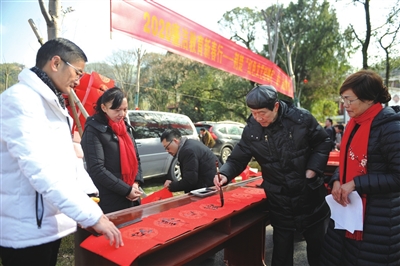 12日上午10点,暖暖的冬阳露出了笑脸,逐渐驱散了浓雾,静谧的熊家湾早已在纷沓而来的游客造访声中醒来。村民们趁着难得的暖阳,熏腊鱼腊肉、晒被子衣物,炸起了麻花,生活的味道在村子的角角落落蔓延开了。市图书馆的工作人员在林间走廊边上挂起了猜谜的条幅,群艺馆的非遗宣传展版在舞台旁一字排开,引人驻足;流动图书车前,村民们挑选出自己喜欢的图书进行阅读,感受阅读带来的轻松和快乐;一旁的桌台上,书法家们挥毫落笔如云烟,为村民写下一副副喜庆的春联,传达了对新年生活的美好祝愿。