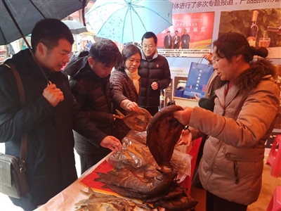 “快来打年货喽!自家喂养熏制而成的腊鱼,货真价实,欢迎选购!”来自通山县远山生合作社王定毕的摊位前挤满了前来购买的客户。