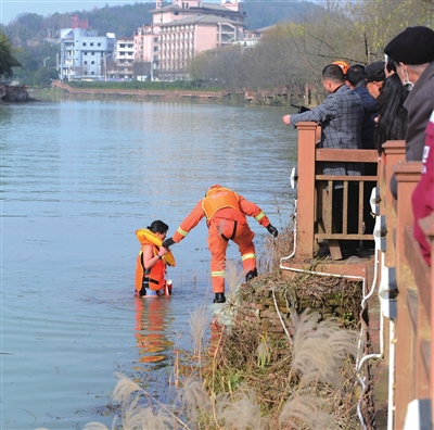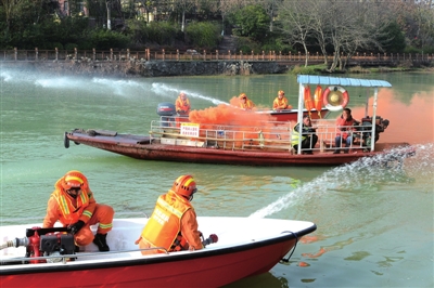 “请问是119吗,我的船失火动不了,我们都不会游泳,请救救我们...”1月19日下午2时许,市区一号桥淦河水域上快艇疾驰,快艇上的救援人员用水枪对“失火”的船只灭火,并将水里的人员救起。