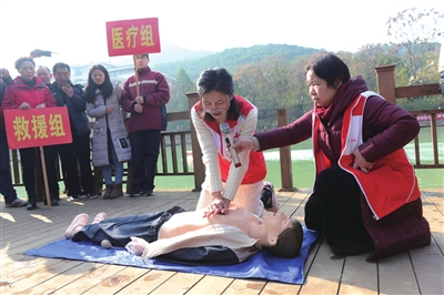 在徒手赴救拖带上岸和浆板救援科目模拟中,一名男子不慎失足跌落水中。接到报警后,市应急指挥中心立即启动《应急预案》,向市水上救援志愿队发出救援指令。救援人员立即赶往事发地,及时将落水人员营救上岸,并进行人工呼吸 和心肺复苏,成功使落水男子脱离危险。而船舶遇险救生科目,则模拟水上救援支援队及时将落水人员营救上岸。现场,还有专业的医疗救护人员,亲身示范、向在场人员讲解,如何进行心肺复苏等紧急救护方法。