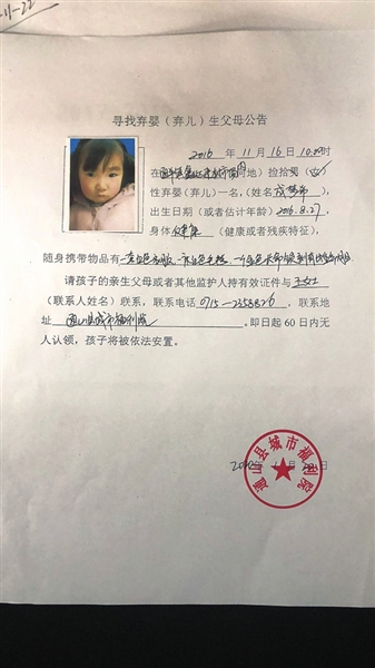 请孩子的亲生父母或者其他监护人持有效证件与王女士联系,联系电话0715-2358826,联系地址:通山县城市福利院。即日起60日内无人认领,孩子将依法安置。