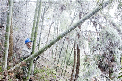 两人熟练地从盘山公路钻进竹林,用手攀附竹子,一不小心,一块冰凌便掉进了脖子里,让人打个冷颤。两人弓着腰缓缓前行,到了13号电杆处,发现有五棵楠竹因冰凌的作用趴在线路上。