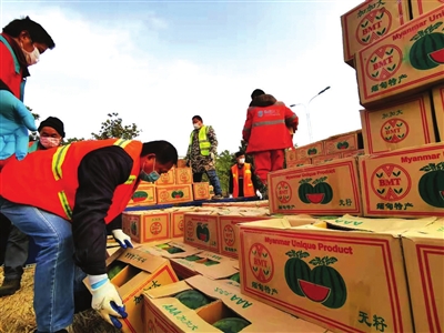 2月13日早8时,5辆载货量30吨的大卡车缓缓停在市消防救援支队特勤中队门口。车上,载满了来自云南省瑞丽市畹町长合商贸有限公司捐赠的150吨缅甸进口无籽西瓜。