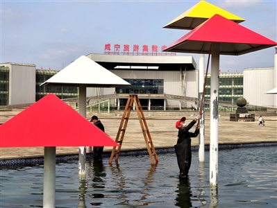 昨日,记者在市旅游集散中心看到,广场前的喷泉内,工人将褪色的景观重新刷上鲜艳的涂料后,焕发了城市生机,提升了城市颜值。 (记者 张仰强)