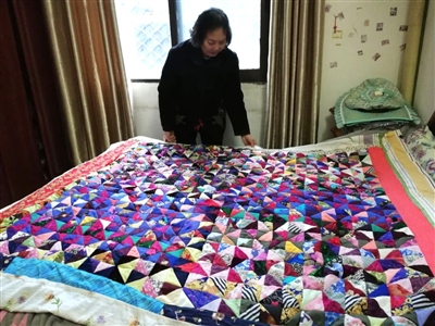 在甘大金家房间床上,记者见到了用2946块碎布缝制成的被面。只见这床被面以很多个小三角形碎布头拼接而成,色彩斑斓,很是漂亮。
