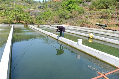 昨日上午,在通山县大畈镇长滩村一组戴石全山间,一个新修建的占地600平方米鱼池里,刁子鱼、草鱼、鲫鱼等分别在各自小池里来回游动,池子上方的水源是引山泉过来,直接流入鱼池。