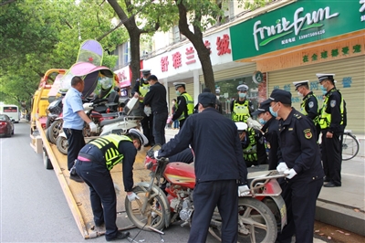 4月17日上午,在城区青龙路浮山学校路段,交警部门正在拖曳一辆套牌“僵尸车”。在咸安南山和鱼水路,交警和城管开展联合执法,整治不按规定停放的电动车,对非法加装遮阳伞具的摩托车、电动车依法进行现场拆除、销毁。
