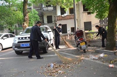 当日上午9时许,在原城管大楼院内,多名城管党员志愿者正在对地面上掉落的树叶进行清理。市城管执法委相关负责人介绍,该委去年年底搬迁至银泉大道原质监局大楼办公后,该办公楼逐渐闲置下来。考虑到此处地处温泉城区核心地带,为缓解停车难,院内未进行封闭管理。然而,随着院内社会车辆停放增多,一些车主将塑料袋等垃圾乱扔。为切实解决环境卫生问题,该委安排人员负责清扫保洁。