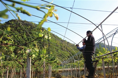 4月12日,记者在通山县南林桥镇石门村四季水果观光采摘园内看到,村民们正在进行大棚加固、理枝除草等春管作业。