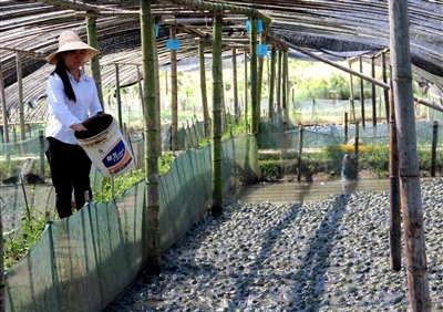 4月26日,咸安区今日种养殖专业合作社的牛蛙养殖基地上,工作人员正在向蛙池投喂饲料。