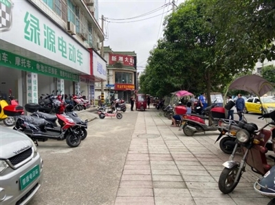 一家名为“绿源电动车”的店铺,将几台电动车公然摆在店外售卖,占据了街道不少位置。一位市民从这里经过时,不得不小心绕开。