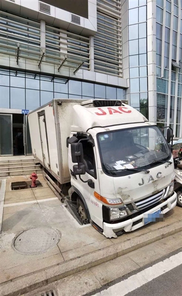 本报讯(记者庞赟)昨日上午,在咸宁传媒大厦广场,一辆送货货车停车不当,将地面上的弱电井井盖压破,货车左前轮塌陷了进去。