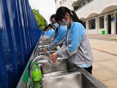 咸安区实验学校副校长张洪海介绍,该校共有686名初三学生复学,日常消毒和体温监测是学校工作的重点。开学之前两次大型消毒,开学后请了一名专业消毒人员,每天早晚各一次对校园进行集中消毒;实行小班制教学,每个班固定26一30人;定时做好学生的晨检和午检制度;完善了校内相关设施,划分了学生学习和运动的专属通道,新增了114个洗手台,配备了消毒剂、洗手液、香皂、纸巾等物品。