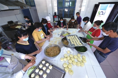 “大家再加把劲,我们争取今天多出几笼包子!”看着第一锅包子送出门,正在忙碌的老师金淑景和其他几位同伴互相加油鼓劲。厨房里,十来位员工正在有序地忙碌着,有的做包子,有的包饺子。