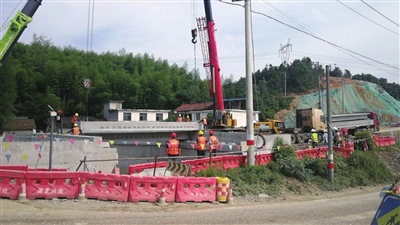 “再靠近一点,好!”当天,随着工人吊装的最后一根水泥钢筋桥板落位,该桥两岸正式“合拢”。(图/文 记者 葛建伟 通讯员 启煌 学杰)