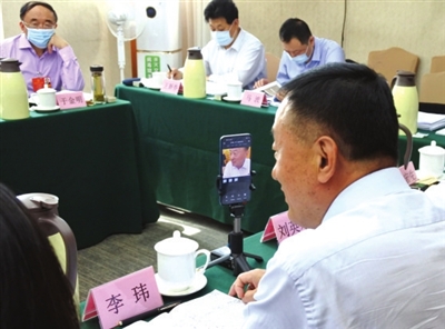 5月23日,全国人大代表李玮在参加山东代表团分组审议政府工作报告时发言。通过代表面前的手机,国家发改委、财政部等有关部门工作人员连线旁听,听取意见建议。