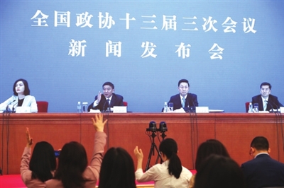 5月20日,全国政协十三届三次会议新闻发布会在北京人民大会堂举行。这是记者在设在梅地亚中心多功能厅的分会场屏幕前举手提问。